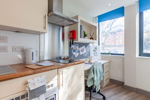 For contemporary designed student accommodation in Bournemouth, check out Skyline. This eclectic accommodation offers en suite rooms in both shared apartments and studios, as well as a cinema room, virtual gym, TV lounge, games areas, sky lounge, roof terrace, and courtyard. It’s also designed with study spaces on every floor including art rooms and a make-up room for the creative students. Location-wise, it’s a 41-minute walk to Bournemouth University or a 43-minute walk to The Arts University Bournemouth, but with loads of buses available, you can save the steps and get to campus in under ten minutes.