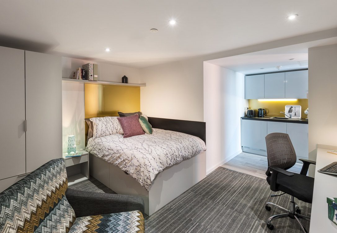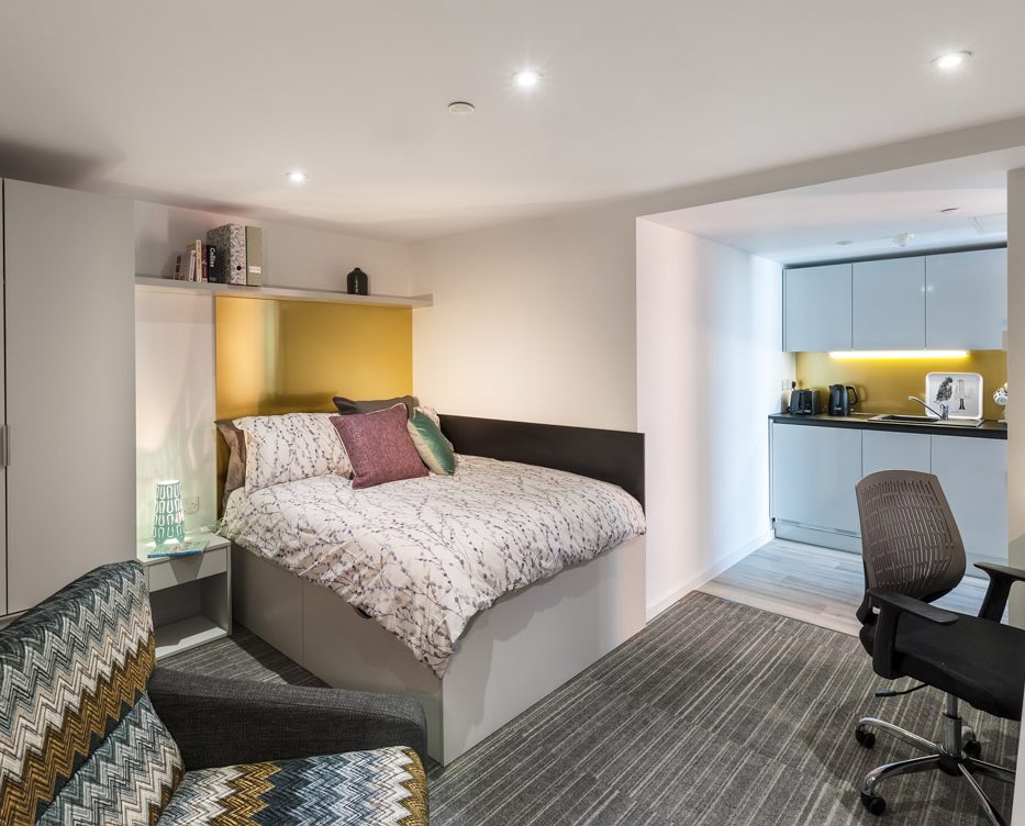 Downing Students accommodation in Coventry gives you a choice of student living options. From bronze, silver and gold studios or shared apartments. All accommodation benefits from all-inclusive services and utility bills, smart TV’s, large beds and plenty of storage. Take a break from study and relax in our excellent communal facilities featuring a cinema room complete with play station, games room and lots of comfortable seating.