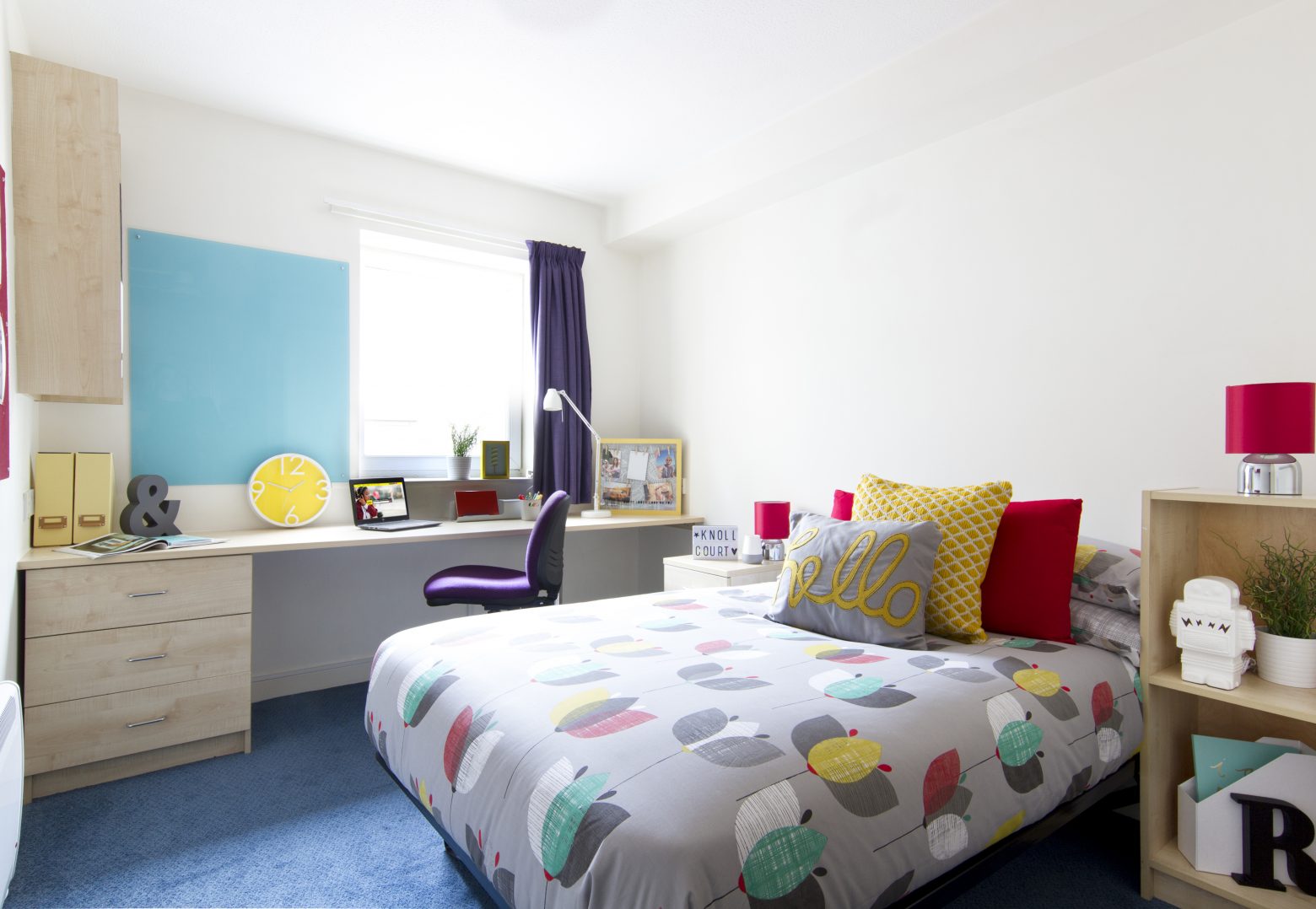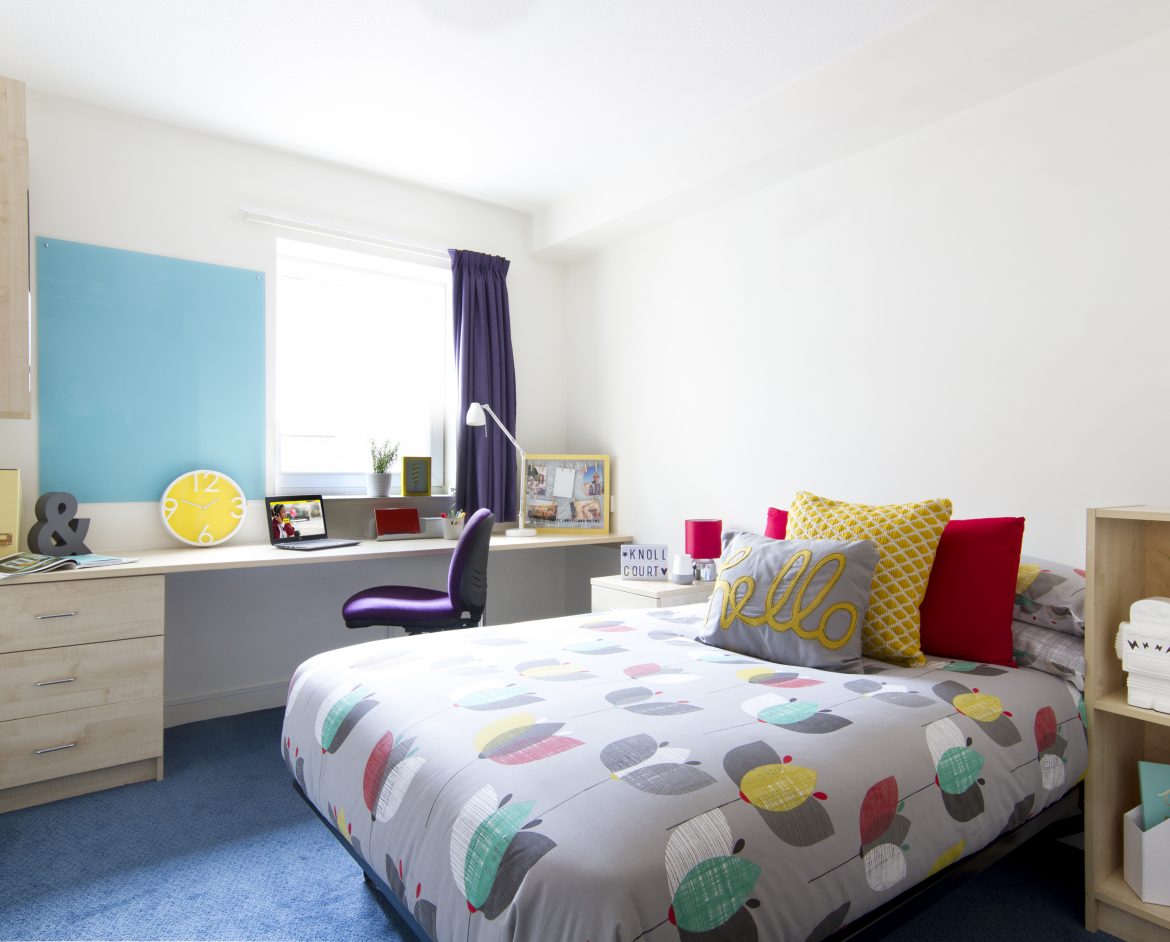 In September 2018 Knoll Court was fitted with some brand new common spaces, perfect to sit back and relax, workout or get your head into some books. We have a brand new common room with study booths, a widescreen TV and sofa area – perfect for hanging out with your fellow residents. There’s also a new fitness suite with a treadmill, cross-trainer, spin bike, water rower, leg press, chest press, yoga mats and a TV to plug in your favourite inspirational training videos! You can even book out the brand new study room for group work, meetings or simply knuckling down before exams.